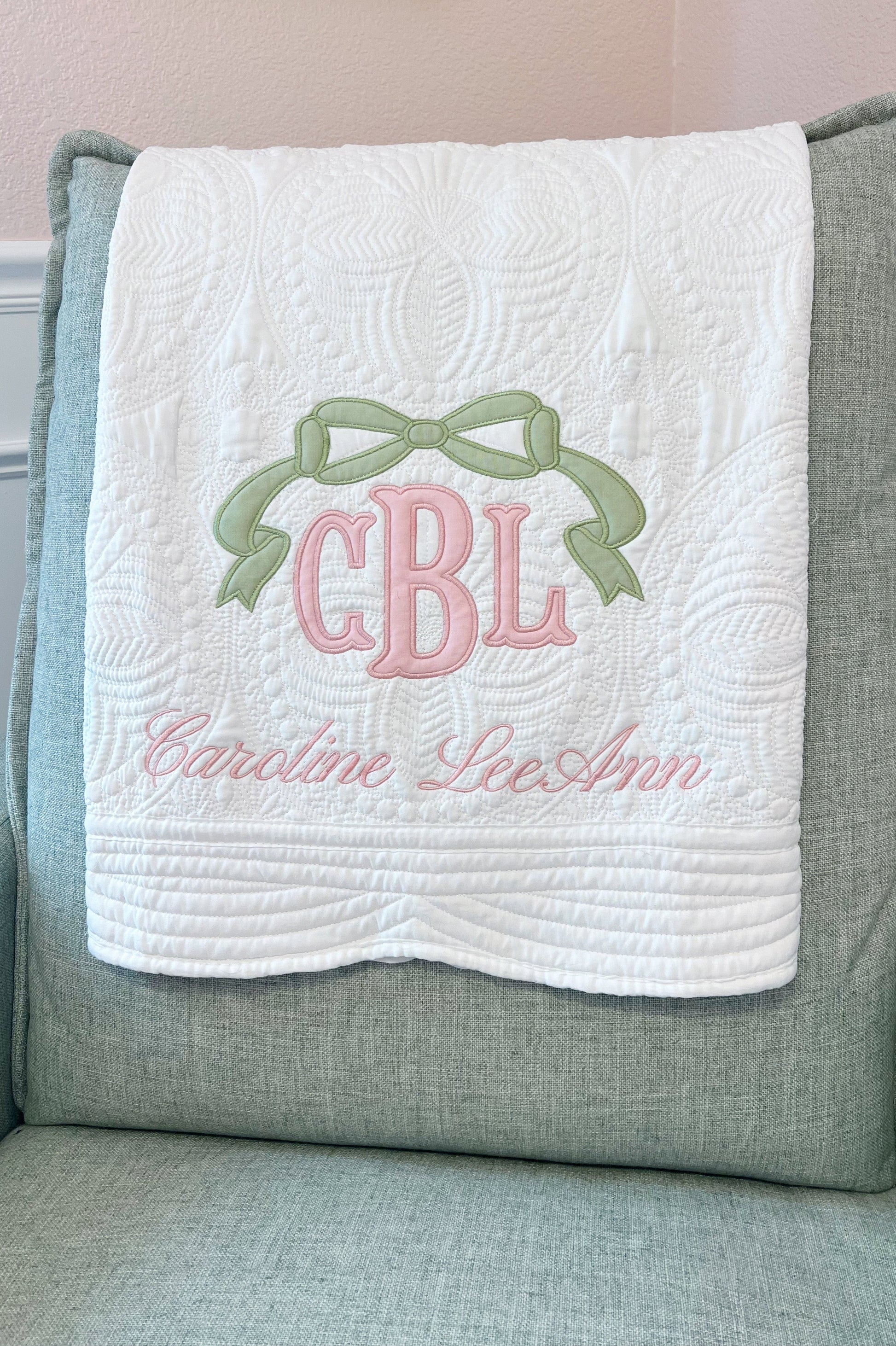 Wrap your little one in love with our personalized embroidered keepsake baby quilt. Each quilt can be customized with baby’s name, birth date, initials, or a special message. Whether it’s for tummy time, nap time, or treasured memories down the road, this quilt is a timeless gift that grows with your baby!